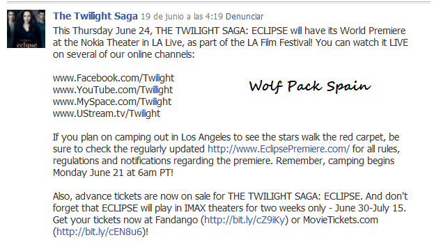 Este jueves 24 de junio LA SAGA CREPÚSCULO: ECLIPSE tendrá su estreno mundial en el Teatro Nokia en LA Live, en el marco del Festival de Cine de Los Angeles! puede sverlo en vivo en varios de nuestros canales online: