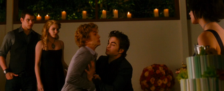 Esta escena es genial! El alambre trabaja mucho mejor que en Crepúsculo. Carlisle está empujando a Esme para ir a ayudar a Bella. Y Emmett y Rosalie siguen todavía allí. Pero me gustaría pensar que Emmett es el pensamiento "Oooh! LUCHA!" en este momento.