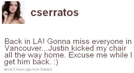 "De vuelta en LA! Añorare a todos en Vancouver ... Justin pateó la silla durante todo el vuelo. Disculpenme un momento se lo regresare :)"