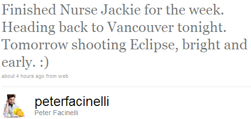 "Terminado Nurse Jackie para la semana. De regreso esta noche a Vancouver. Mañana rodaje de Eclipse, muy temprano. :)"