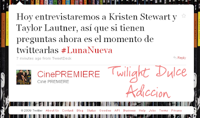 Chicas CINEPREMIERE a puesto en Twitter que hoy entrevistaran a Taylor y Kristen si tienen preguntas pueden enviarselas!!!