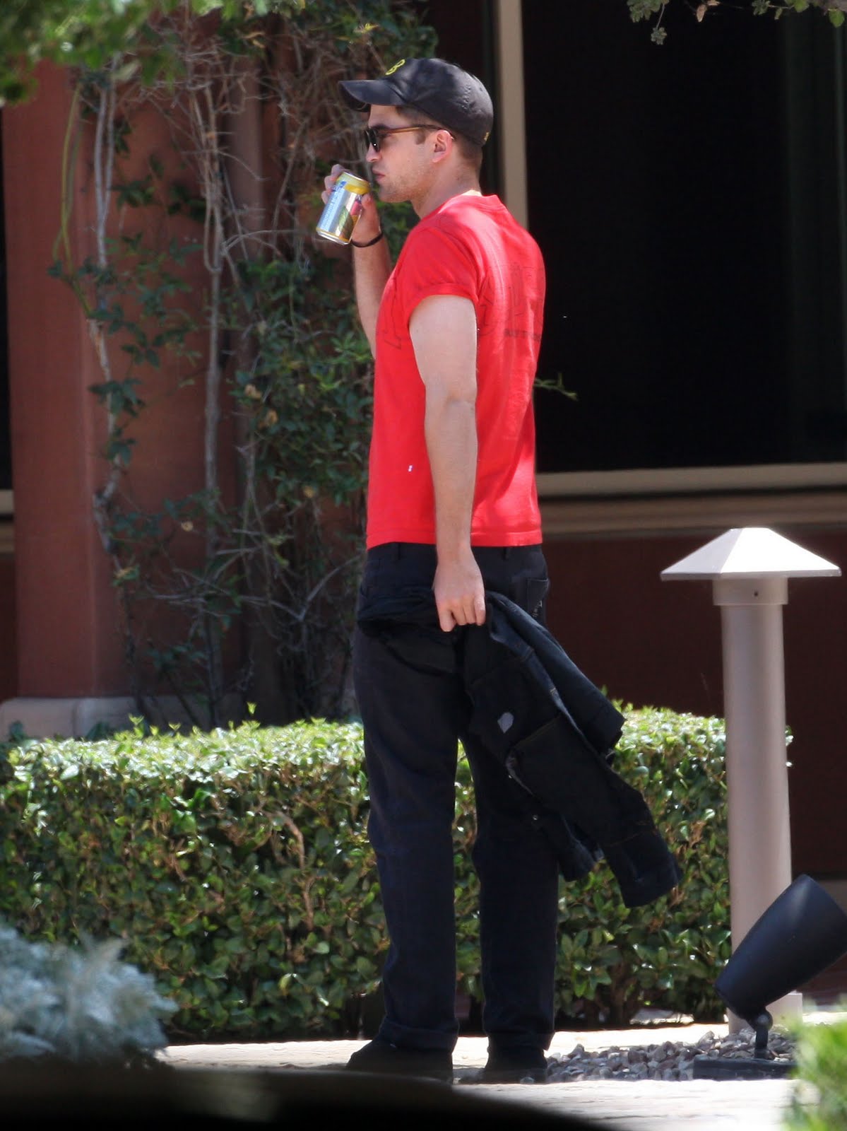 Deberia ser ilegal ese tipo de comportamiento tan provocativo por su parte... Pero es que en serio, miren el color de sus labios y la forma en como el labio inferior se moldea a la forma de la lata... mmmmmm... Me encanta la manera que la combinacion del pantalon negro y la franela roja hacen ver su piel mas blanca... y sus brazos, Oh Dios! Sus brazos!!.... Yo como que mejor me callo porque estoy sintiendo como que hace mas calor de repente.