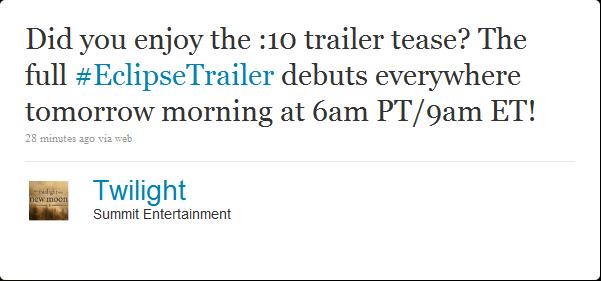 ¿Te gustó el teaser trailer de 10 segundos? El trailer oficial de Eclipse se debuta mañana por la mañana a las 6 pm PT/ 9 am horas!