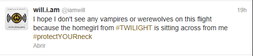 Para las que no saben will i am es el cantante de the black eyed peas y esta es su cuenta oficial, comprobado por twitter - Yo no esperaba ver a ningún vampiro o hombres lobo en este vuelo porque mi vecina de #TWILIGHT está sentada frente a mí #protege TU cuello.